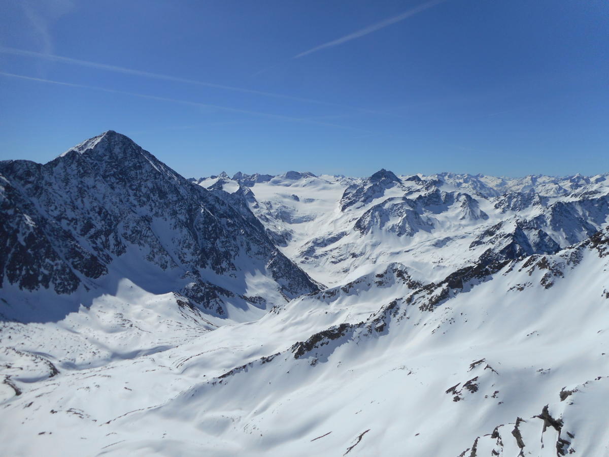 Na vrchol vedoucí dlouhý hřebínek se musíme vydat opět bez lyží, které necháváme pod skalkami ve výšce 3160 m n. m. Z vrcholu, na kterém je zajímavá kovová konstrukce kříže, je parádní rozhled, nejenom na vrcholy, které jsme navštívili, ale na spoustu dalších tyčících se nad údolím Längentaler, třeba výrazný Lüsener Fernerkogel (3298 m n. m.).